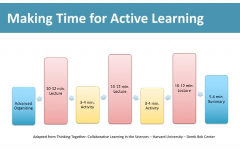 The following chart offers a template for organizing a class period around active learning methods while also allowing time for traditional lecture to provide students with the knowledge necessary to complete the learning activities: